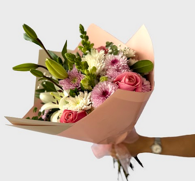 Ramo de flores mixtas en tonos pasteles con papel con papel decorativo.